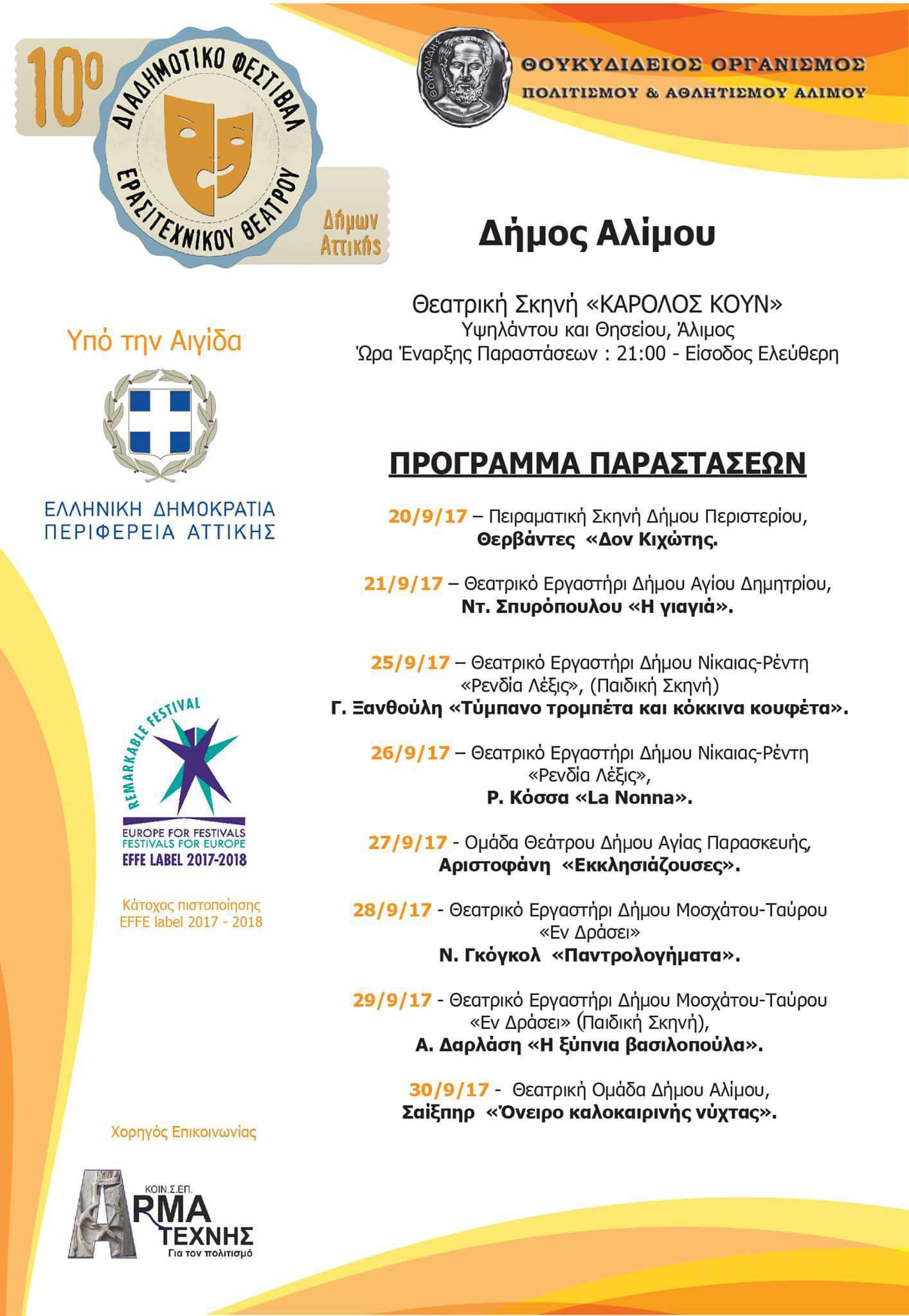 Στο πλαίσιο του 10ου Διαδημοτικού Φεστιβάλ Ερασιτεχνικού Θεάτρου Δήμων Αττικής και υπό την αιγίδα της Περιφέρειας Αττικής, ο Δήμος Αλίμου και ο Θουκυδίδειος Οργανισμός Πολιτισμού και Αθλητισμού Αλίμου (Θ.Ο. Π. Α. Α.) υποδέχονται το τελευταίο δεκαήμερο του Σεπτεμβρίου στον Άλιμο τις θεατρικές ομάδες των Δήμων Περιστερίου, Αγίου Δημητρίου, Νίκαιας – Ρέντη, Αγίας Παρασκευής και Μοσχάτου – Ταύρου, ενώ η τελευταία παράσταση θα δοθεί από τη θεατρική ομάδα του Δήμου Αλίμου.
