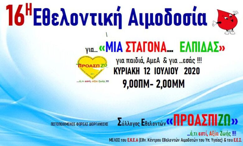 16η Εθελοντική Αιμοδοσία: Προασπίζω την ζωή για… «Μια σταγόνα…Ελπίδας»