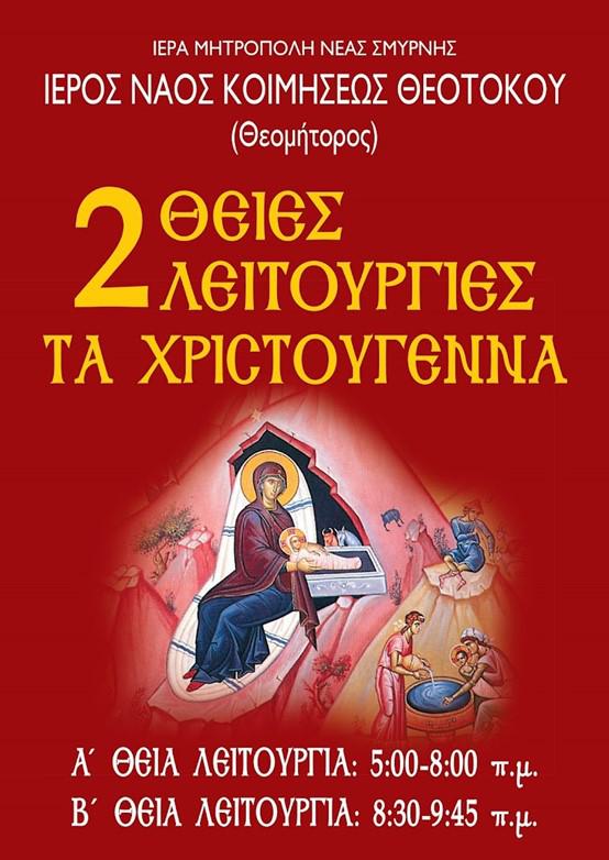Η θεία λειτουργία, η θεόδοτη απόδοση τιμών, ευχαριστιών και παρακλήσεων, με τη συμμετοχή των πιστών θα τελεστεί στον Ιερό Ναό Κοιμήσεως Θεοτόκου (Θεομήτορος) με 2 Θείες Λειτουργίες.