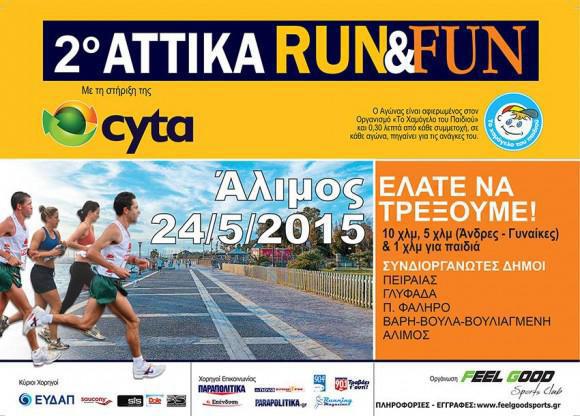 Ο Δήμος Αλίμου και ο Αθλητικός Σύλλογος «Feel Good Sports Club» διοργανώνουν την Κυριακή, 24 Μαΐου 2015 το 2ο ATTIKA RUN & FUN Grand Prix με τη στήριξη της Cyta. Μέρος των εσόδων θα δοθούν στο «Χαμόγελο του Παιδιού».