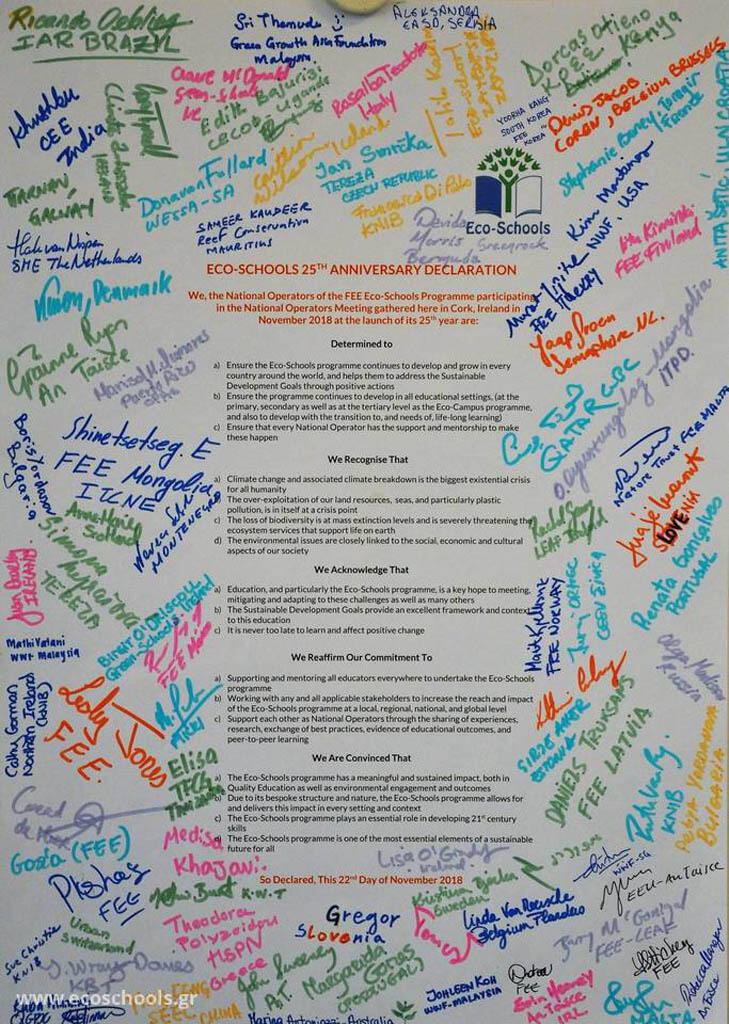 H επετειακή για τα 25 χρόνια “Οικολογικά Σχολεία”, διακήρυξη αποτελεί τη δέσμευση μας στην ανάπτυξη του προγράμματος από τις 68 χώρες σε κάθε χώρα του κόσμου, βοηθώντας και ενδυναμώνοντας νέους ανθρώπους να προβούν σε θετικές πράξεις για ένα αειφόρο μέλλον για όλους.