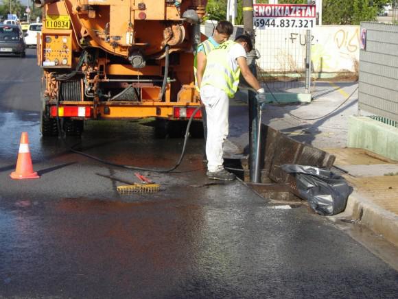 Το ειδικό συνεργείο συνεχίζοντας το έργο του – που περιλαμβάνει 1174 φρεάτια – απομακρύνει όλα των υλικά που έχουν φράξει τις σχάρες των φρεατίων υδροσυλλογής ή τα στόμια αλλά και τα διάφορα σκουπίδια ή υλικά όπου βρίσκονται σε τέτοια απόσταση που να δημιουργούν κινδύνους για την λειτουργικότητά τους.