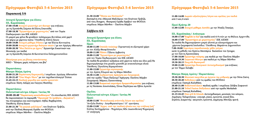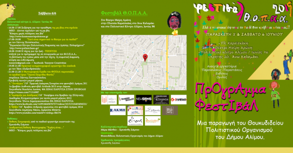 Τα τμήματα του Θουκυδίδειου Πολιτιστικού Οργανισμού Αλίμου, σας προσκαλούν σε ένα διήμερο φεστιβάλ στις 5 & 6 Ιουνίου 2015 στην πλ. Καραϊσκάκη στο Άνω Καλαμάκι, για να επαναφεύρουμε παρέα το παιδί που κρύβουμε μέσα μας, να μάθουμε πώς μέσα από την φροντίδα του εαυτού μας μαθαίνουμε να αγαπάμε, να ανακαλύψουμε την ευεργετικές ιδιότητες της συνδημιουργίας.