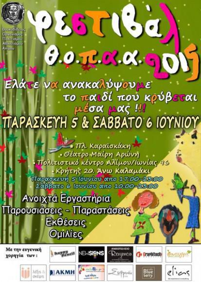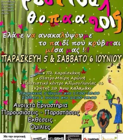 Τα τμήματα του Θουκυδίδειου Πολιτιστικού Οργανισμού Αλίμου, σας προσκαλούν σε ένα διήμερο φεστιβάλ στις 5 & 6 Ιουνίου 2015 στην πλ. Καραϊσκάκη στο Άνω Καλαμάκι, για να επαναφεύρουμε παρέα το παιδί που κρύβουμε μέσα μας, να μάθουμε πώς μέσα από την φροντίδα του εαυτού μας μαθαίνουμε να αγαπάμε, να ανακαλύψουμε την ευεργετικές ιδιότητες της συνδημιουργίας.
