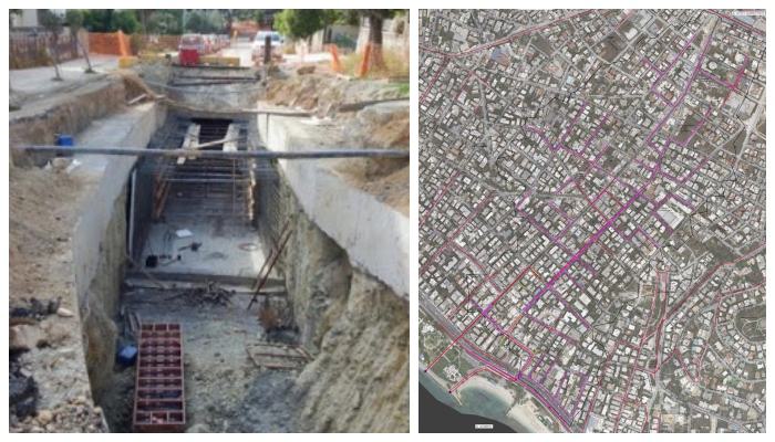 Στον χάρτη μπορείτε να δείτε με μωβ χρώμα τους νέους αγωγούς που θα κατασκευαστούν και με κόκκινο χρώμα το υφιστάμενο δίκτυο ομβρίων υδάτων, το οποίο θα “κουμπώσει” πάνω στο νέο, κύριο δίκτυο.