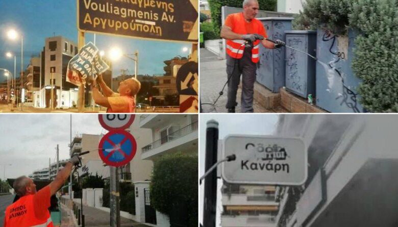 Καθαρίζουμε όλες τις κολόνες, τις στάσεις, τα ΚΑΦΑΟ, τις πινακίδες σήμανσης και ονοματοθεσίας οδών από παράνομες αφίσες, αυτοκόλλητα και ταμπέλες κάθε είδους. Ξεκινήσαμε από Λ. Ποσειδώνος και συνεχίζουμε Καλαμακίου, Θεομήτορος, Ιωνίας, Δωδεκανήσου, Κυθηρίων, Παπανδρέου, Αγίου Δημητρίου και Αλίμου.