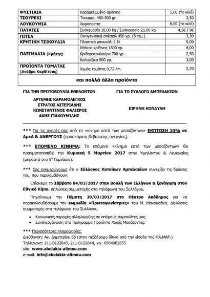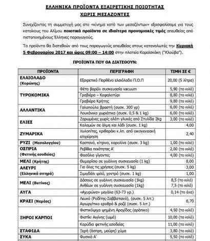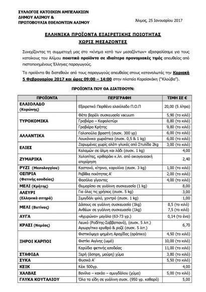 Ποιοτικά προϊόντα σε ιδιαίτερα προνομιακές τιμές θα διατεθούν από τους παραγωγούς απευθείας στους καταναλωτές την Κυριακή 5 Φεβρουαρίου (09:00 – 14:00), στην πλατεία Καραϊσκάκη «Κλούβα», στο Άνω Καλαμάκι. Ο σύλλογος κατοίκων Αμπελακίων Αλίμου και οι εθελοντές κάνουν έκκληση στους καταναλωτές να μην ξεχνούν να ζητούν αποδείξεις από τους παραγωγούς!