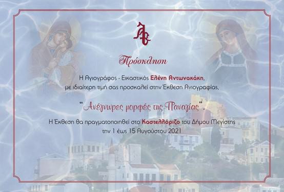 Το νησί των Δωδεκανήσων που βρέχεται από το Λύκιο Πέλαγος, το Καστελλόριζο, αυτό το φυσικό λιμάνι που ο οικισμός με τα αυθεντικά, αναπαλαιωμένα αρχοντικά, δείγμα παραδοσιακής Δωδεκανησιακής αρχιτεκτονικής, δέχεται τα φώτα της απόλυτης αρμονίας και ομορφιάς επιλέγεται από την Κρητικιά εικαστικό-αγιογράφο Ελένη Αντωνακάκη, για να παρουσιάσει την έκθεση αγιογραφίας της με τίτλο: «Ανέγνωρες μορφές της Παναγίας- Μήτηρ Αγνεύουσα και Παρθένος θηλάζουσα» από την 1-15 Αυγούστου.
