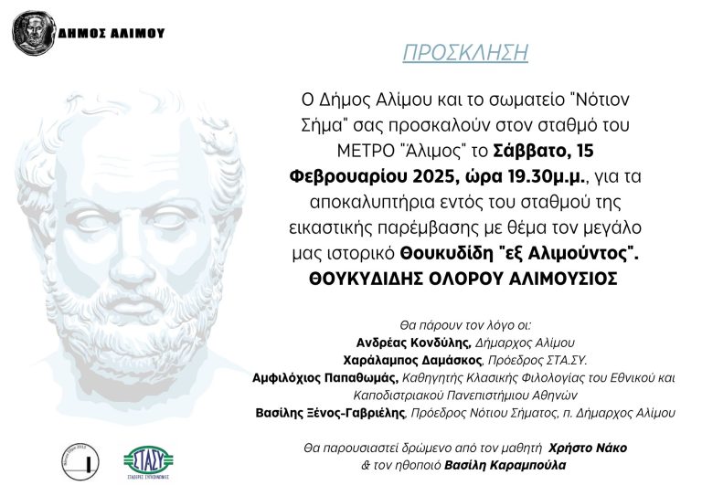 Μια εικαστική παρέμβαση με θέμα τον Θουκυδίδη πραγματοποιήθηκε με τη συνεργασία του Δήμου Αλίμου και του σωματείου «Νότιον Σήμα» στον Σταθμό «Άλιμος» του Μετρό, με σκοπό να τιμηθεί ο μεγάλος ιστορικός της αρχαιότητας στον τόπο που γεννήθηκε.