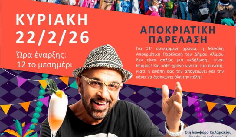 Σε ρυθμούς καρναβαλιού κινείται πλέον ο Άλιμος, με τον Δήμαρχο Ανδρέα Κονδύλη να δίνει το σύνθημα για τη φετινή μεγάλη αποκριάτικη παρέλαση, η οποία υπόσχεται να είναι η πιο εντυπωσιακή και πολυπληθής που έχει γίνει ποτέ στην πόλη.