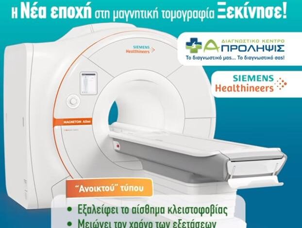 To διαγνωστικό κέντρο Α-ΠΡΟΛΗΨΙΣ , πάντα εστιασμένο στην εισαγωγή καινοτόμων και σύγχρονων Ιατρικών Τεχνολογιών, ανακοινώνει την έναρξη της συνεργασίας του µε την πρωτοπόρο εταιρία Ιατροτεχνολογικού εξοπλισμού, Siemens Healthineers, στο τμήμα της Μαγνητικής Τομογραφίας.