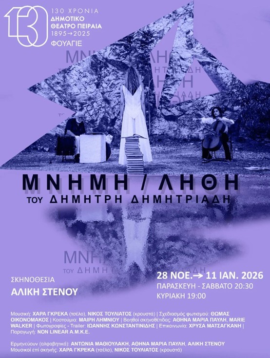 Η παράσταση «ΜΝΗΜΗ/ΛΗΘΗ» γίνεται η αφορμή για να εξερευνήσουμε μαζί της την αγωνία και την αβεβαιότητα των ανθρώπων που βρίσκονται αντιμέτωποι με τη λήθη, είτε ως συναίσθημα του θανάτου, είτε ως απώλεια της μνήμης. «Μέσα από τη δική του σιωπή και τη δική του τελευταία λέξη, το έργο μας θυμίζει πως η πιο ουσιαστική στιγμή είναι εκείνη όπου, από όλα όσα θα μπορούσαμε να πούμε, μένει μόνο αυτό που πραγματικά αξίζει.