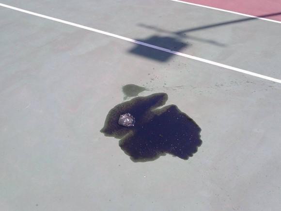 Κάποιοι πέταξαν αυτοσχέδιες σακούλες (‘μπόμπες’) 2 με λάδια αυτοκινήτου και 1 με μπογιά μέσα στο χώρο του γηπέδου, στο ειδικό δάπεδο του τένις.