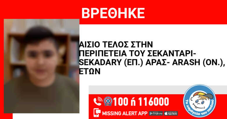 Ο Σεκαντάρι- Sekadary (επ.) Αράς- Arash (ον.), 15 ετών, βρέθηκε στην περιοχή του κέντρου της Αθήνας, από τις Αστυνομικές Αρχές και είναι καλά στην υγεία του. Είχε εξαφανιστεί από την περιοχή του Αλίμου, στις 27/07/2025 και «Το Χαμόγελο του Παιδιού» προχώρησε στη δημοσιοποίηση των στοιχείων του, κατόπιν εισαγγελικής εντολής, καθώς συνέτρεχαν λόγοι που έθεταν τη ζωή του σε κίνδυνο.