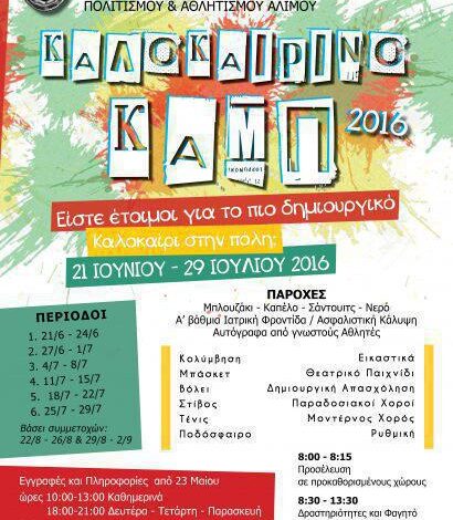 Είστε έτοιμοι για το πιο δημιουργικό καλοκαίρι στην πόλη; Ο Θουκυδίδειος Οργανισμός Πολιτισμού και Αθλητισμού Αλίμου, διοργανώνει το “ΚΑΛΟΚΑΙΡΙΝΟ ΚΑΜΠ 2016” από 21 Ιουνίου έως 29 Ιουλίου. Περιλαμβάνει: Κολύμβηση, μπάσκετ, βόλει, στίβο, τένις, ποδόσφαιρο, εικαστικά, θεατρικό παιχνίδι, δημιουργική απασχόληση, παραδοσιακούς και μοντέρνους χορούς και ρυθμική γυμναστική.