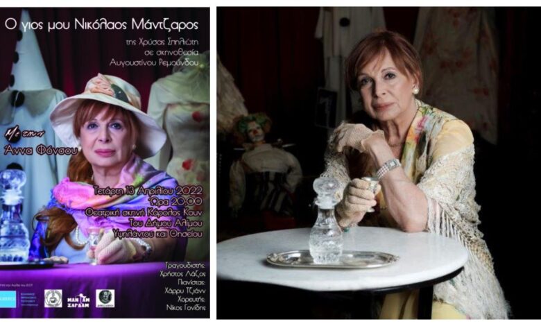 Η αναβληθείσα δωρεάν θεατρική παράσταση «Ο γιος μου Νικόλαος Μάντζαρος» της Χρύσας Σπηλιώτη με την Άννα Φόνσου σε σκηνοθεσία Αυγουστίνου Ρεμούνδου, θα πραγματοποιηθεί την Τετάρτη 13 Απριλίου 2022, στις 8μ. μ.