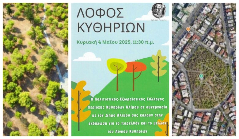 Ο Πολιτιστικός-Εξωραϊστικός Σύλλογος Περιοχής Κυθηρίων Αλίμου σε συνεργασία με τον Δήμο Αλίμου, διοργανώνουν την Κυριακή 4 Μαΐου 2025, στις 11:30, εκδήλωση για το παρελθόν και το μέλλον του Λόφου Κυθηρίων.