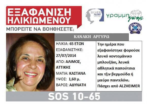 Αργυρώ Κανάκη 65 ετών. Εξαφανίστηκε στις 27 Ιουλίου. Πηγή: geitoniamou.gr