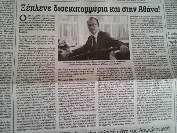 Σύμφωνα με σημερινό πρωτοσέλιδο δημοσίευμα της εφημερίδας Κontra news, η σύλληψη του Κινέζου δισεκατομμυριούχου Guo Guangchang, ο οποίος φέρεται να εμπλέκεται σε σκάνδαλο διαφθοράς, πιθανότατα θα έχει επιπτώσεις και στις ελληνικές επιχειρήσεις στις οποίες είχε επενδύσει. Η εφημερίδα γράφει ότι ο Κινέζος κροίσος ξέπλενε δισεκατομμύρια και στην Αθήνα.