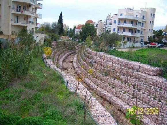 Η ευρηματική ελληνική εργολαβική πιάτσα χρησιμοποίησε τις τελευταίες δεκαετίες τα «σαρζανέτια» για να «ντύσει» τα πρανή των ρεμάτων. Μάλιστα τα σχετικά έργα πλασαρίστηκαν στην αρχή και ως οικολογικά. Το αποτέλεσμα φαίνεται στη φωτογραφία. Σε αυτή απεικονίζεται ένα ρέμα στην Παλλήνη εγκιβωτισμένο με «σαρζανέτια». Η φύση του ρέματος, δηλαδή η πανίδα και η χλωρίδα του έχουν εξοριστεί οριστικά από αυτό. Το ρέμα αυτό έχει γίνει ένας οχετός, χωρίς καμία πλέον περιβαλλοντική αξία. Οι κάτοικοι των σπιτιών που είναι δίπλα του, σίγουρα θα επιθυμούν να κλείσει και από πάνω, έτσι ώστε να μην υφίστανται τις συνέπειες ενός οχετού δίπλα τους. Το ίδιο βέβαια θα επιθυμούν και τα εργολαβικά συμφέροντα που προώθησαν τον εγκιβωτισμό αυτού του ρέματος.