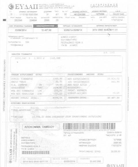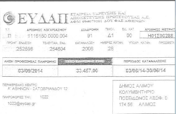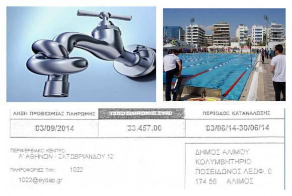 Ο λογαριασμός της ΕΥΔΑΠ για το Δημοτικό Κολυμβητήριο Αλίμου. Οφειλόμενο ποσό 33.457 ευρώ.Λήγει στις 3 Σεπτεμβρίου.