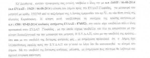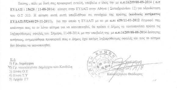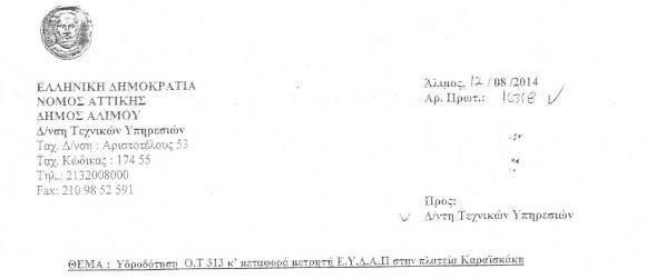 Καμία εργασία δεν πρόκειται να πραγματοποιήσει η ΕΥΔΑΠ στο Δήμο Αλίμου αν δεν εξοφληθούν οι ληξιπρόθεσμες οφειλές. Αυτό προκύπτει από εσωτερικό έγγραφο της Τεχνικής Υπηρεσίας. Υπάλληλοι του δήμου Αλίμου έκαναν αίτηση στην ΕΥΔΑΠ Γλυφάδας για τη μεταφορά μετρητή στην πλατεία Καραϊσκάκη και πήραν αρνητική απάντηση. Το ίδιο έγινε και σε αίτηση που υποβλήθηκε στο Περιφερειακό Κέντρο Αθηνών (Σατωβριάνδου 12) για την υδροδότηση του Ο.Τ 313. Η αίτηση υποβλήθηκε την περασμένη Δευτέρα 11 Αυγούστου.