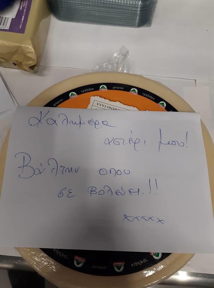 Ήταν μια καινούργια παραλαβή τυριού και έπρεπε να το βάλει ο πρωινός ,γιατί ήταν προσφορά της επόμενης μέρας .Άφησα λοιπόν το συγκεκριμένο σημείωμα στον συνάδελφο ,είναι ίδια τρέλα και αυτός. Όλοι έχουμε πολύ καλές σχέσεις. Αυτό παίζει πολύ σημαντικό ρόλο όχι μόνο για εμάς αλλά και για τους πελάτες. Κινούμαστε στο ίδιο μήκος κύματος, με την προσωπικότητα και την ιδιαιτερότητα του ο καθένας.