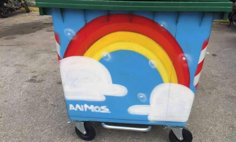 Με πολύ φαντασία, χρώματα και χαρούμενα σχέδια ζωγραφίζει τους κάδους απορριμμάτων.