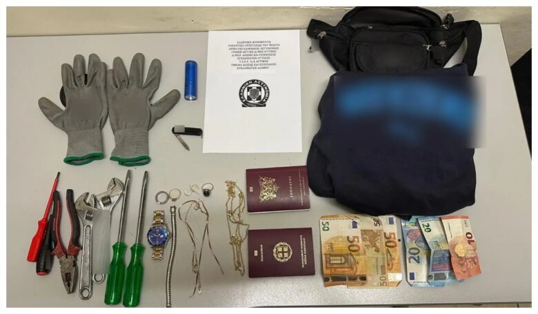 Κατόπιν ελέγχου, βρέθηκαν στην κατοχή του διαρρηκτικά εργαλεία, γάντια, -2- διαβατήρια, το χρηματικό ποσό των 200 ευρώ, καθώς και τα αφαιρεθέντα αντικείμενα, τα οποία αποδόθηκαν στην παθούσα.