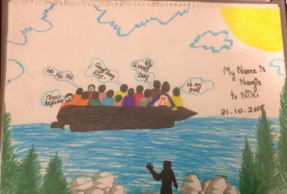 Τέλος σας στέλνω μια ζωγραφιά που μου χάρισε με αφιέρωση η δωδεκάχρονη Ναργκις απο το Αφγανιστάν που φιλοξενήθηκε στο Κέντρο Ελληνικού και απεικονίζει την πλαστική βάρκα με την οποία έφτασε στην Ελλάδα .Διαβάστε σας παρακαλώ τα επιφωνήματα -κραυγές όπως τα γράφει το δωδεκάχρονο κορίτσι, μεταξύ αυτών το συγκλονιστικό “good bye life”