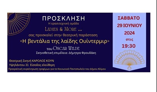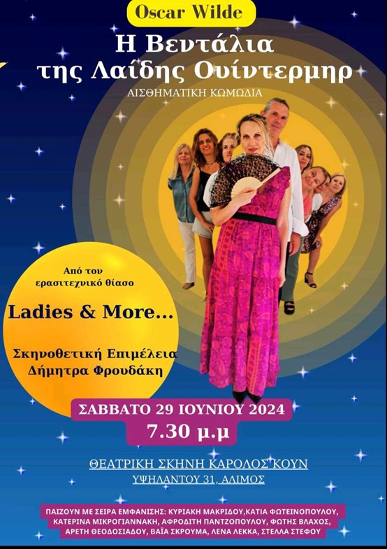 Ο ερασιτεχνικός θίασος Ladies& More… σε σκηνοθετική επιμέλεια Δήμητρας Φρουδάκη παρουσιάζει το Σάββατο 29 Ιουνίου 2024 στις 7.30 μ.μ στην Θεατρική Σκηνή Κάρολος Κουν (Υψηλάντου 31 Άλιμος) την αισθηματική κωμωδία του Οscar Wilde, « Η Βεντάλια της Λαίδης Ουΐντερμηρ», ένα θεατρικό έργο σε τέσσερις πράξεις.