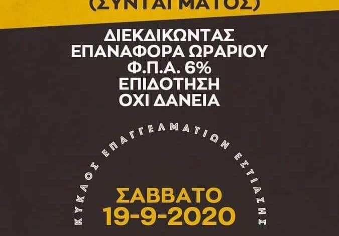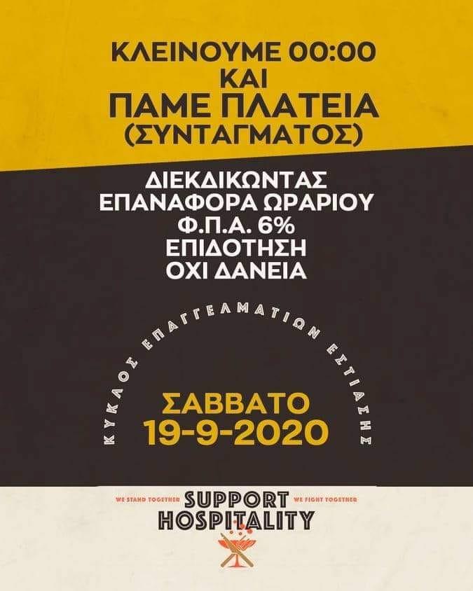 Το Σάββατο 19-9-2020 διαδηλώνουν ειρηνικά και με τις δέουσες αποστάσεις, αρχικά για «την εις στο διηνεκές παράταση του μειωμένου ωραρίου», στην κάτω πλευρά της πλατείας Συντάγματος αφού κλείσουν τα μαγαζιά τους στις 00:00