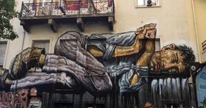 «Ένας άστεγος άνδρας ξαπλωμένος στο δρόμο», ένα γκράφιτι για όλους τους φτωχούς και άστεγους, αφιερωμένο από τον καλλιτέχνη WD.