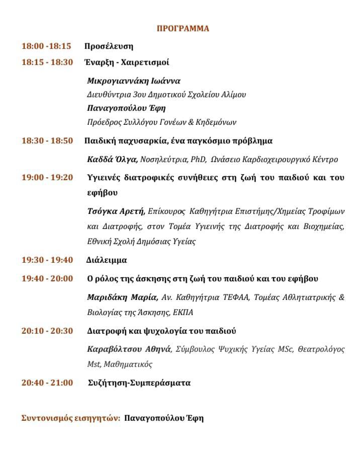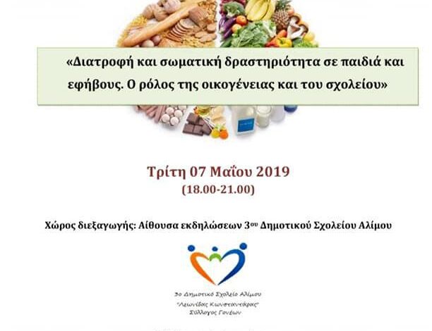 Με αφορμή και μόνο αυτό το γεγονός ο Σύλλογος Γονέων και Κηδεμόνων σε συνεργασία με τον Σύλλογο Διδασκόντων του 3ο Δημοτικού Σχολείου Αλίμου, διοργανώνει την Τρίτη 7 Μαΐου από τις 18:00 έως τις 21:00 ενημερωτική ημερίδα με θέμα « Διατροφή και σωματική δραστηριότητα σε παιδιά και εφήβους .Ο ρόλος της οικογένειας και του σχολείου». Νοσηλευτές, επίκουροι καθηγητές χημείας τροφίμων και διατροφής ,ψυχολόγοι και αθλίατροι θα μιλήσουν για τους παράγοντες που προκαλούν την παιδική παχυσαρκία, την αντιμετώπιση της, τον ρόλο της άσκησης στην ζωή των παιδιών και των εφήβων καθώς και την σημασία της διατροφής στην ψυχολογία τους.