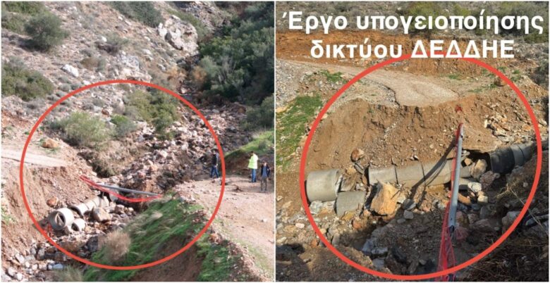 Άφησαν μάλιστα κατά την εκτέλεση των έργων κάποιον σωλήνα (!) για να περάσουν τα νερά… Το αποτέλεσμα το βλέπετε στις εικόνες, το νερό παρέσυρε τα πάντα και τα καλώδια πλέον κρέμονται στον αέρα, πάνω από τη ρεματιά.