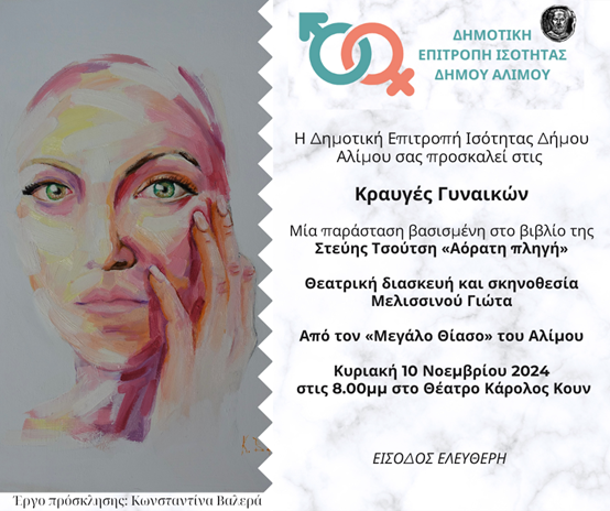 Στο πλαίσιο της Παγκόσμιας Ημέρας για την Εξάλειψη της Βίας κατά των Γυναικών, η Επιτροπή Ισότητας του Δήμου Αλίμου μας καλεί στο Θέατρο Κάρολος Κουν την Κυριακή 10 Νοεμβρίου 2024, στις 8.00 μμ για να παρακολουθήσουμε την θεατρική παράσταση, «Κραυγές Γυναικών», σε διασκευή και σκηνοθεσία της Γιώτας Μελισσινού,από τον «Μεγάλο Θίασο» του Αλίμου, βασισμένη στο βιβλίο της Στεύης Τσούτση « Αόρατη Πληγή» από τις εκδόσεις Νίκας.
