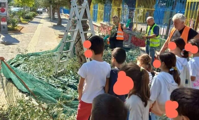 7ο), στο Άνω Καλαμάκι όπου μαθητές παρακολουθούν τη διαδικασία του μαζέματος των ελιών)