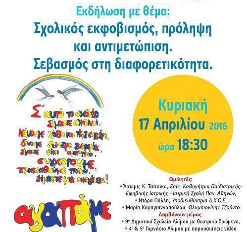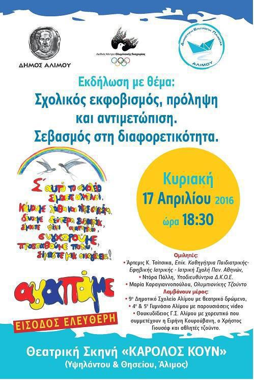 Η Δημοτική Επιτροπή Παιδείας του Δήμου Αλίμου και το Διεθνές Κέντρο Ολυμπιακής Εκεχειρίας (Δ.Κ.Ο.Ε.) σας προσκαλούν στη Θεατρική Σκηνή «ΚΑΡΟΛΟΣ ΚΟΥΝ» (Υψηλάντου & Θησείου, Άλιμος) στην εκδήλωση με θέμα: Σχολικός εκφοβισμός, πρόληψη και αντιμετώπιση. Σεβασμός στη διαφορετικότητα.
