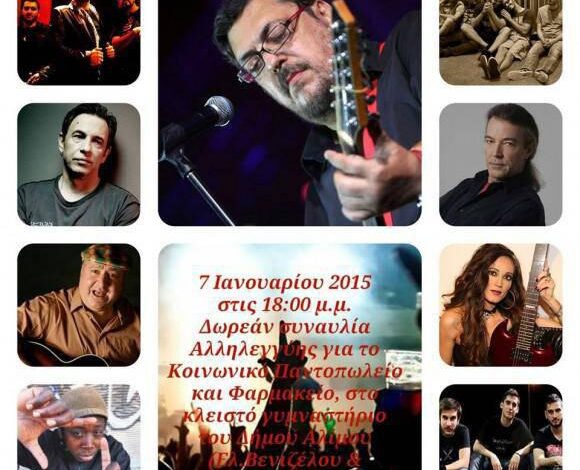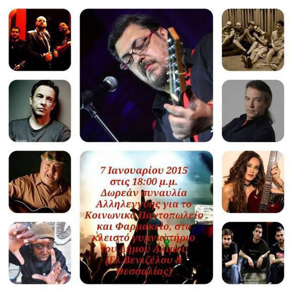 Ο Λαυρέντης Μαχαιρίτσας, ο Γιάννης Μηλιώκας, ο Διονύσης Τσακνής, η Τάνια Κικίδη, ο Περικλής Λoρίδας, οι Δ.Ο.Γ.Μ.Α., οι Κρυστάλλινες Σκιές, ο Γιάννης Νικολάου (Λαθρεπιβάτες),οι the wigs και ο MC Yinka σε δωρεάν συναυλία Αλληλεγγύης για το Κοινωνικό Παντοπωλείο-Φαρμακείο στο Κλειστό Γυμναστήριο του Δήμου Αλίμου (Ελ. Βενιζέλου & Θεσσαλίας). Αντί για εισιτήριο φέρνουμε (προαιρετικά) τρόφιμα και φάρμακα για όσους συμπολίτες μας έχουν ανάγκη. Τετάρτη 7 Ιανουαρίου 2015, ώρα 18:00 μ.μ.