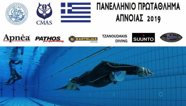 Η ΕΟΥΔΑ διοργανώνει το Πανελλήνιο Πρωτάθλημα Άπνοιας του έτους 2019. Το Πανελλήνιο Πρωτάθλημα του έτους 2019 θα διεξαχθεί στις 3 Νοεμβρίου, στο Δημοτικό κολυμβητήριο Αλίμου.