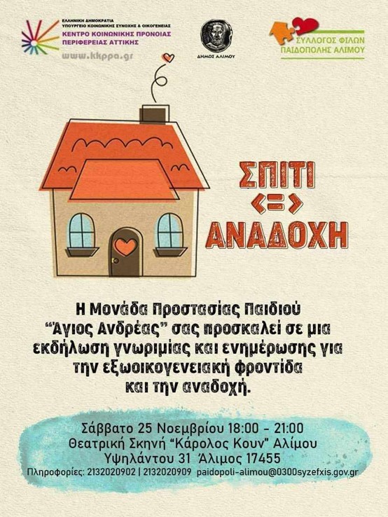 Η Μονάδα Προστασίας Παιδιού «Άγιος Ανδρέας» σας προσκαλεί το Σάββατο 25 Νοεμβρίου στις 18:00 στην Θεατρική Σκηνή «Κάρολος Κουν» Αλίμου σε μια εκδήλωση γνωριμίας και ενημέρωσης για την εξωοικογενειακή φροντίδα και την αναδοχή.
