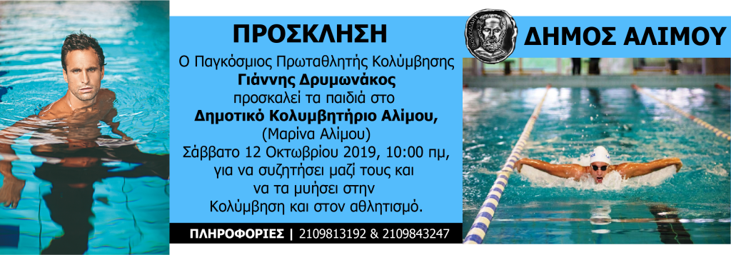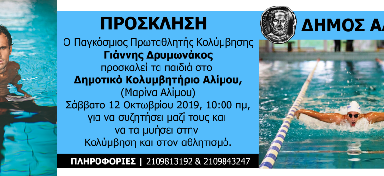 Ο Έλληνας Πρωταθλητής Κολύμβησης στην Ευρώπη, Γιάννης Δρυμωνάκος, το καλό παιδί των «Θαλασσόλυκων», ο Έλληνας κολυμβητής στην πεταλούδα με τις περισσότερες διακρίσεις, ο οποίος άρχισε την κολύμβηση με προτροπή της μητέρας του, η οποία θαύμαζε τον Μαρκ Σπιτς, έρχεται στο Δημοτικό Κολυμβητήριο Αλίμου, να μυήσει τους μικρούς του φίλους στα μυστικά του αθλήματος του.
