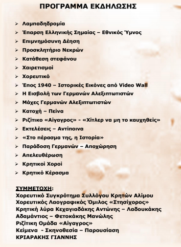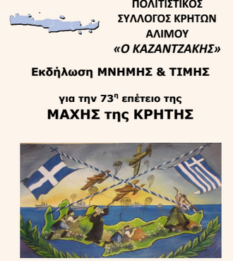 O Πολιτιστικός Σύλλογος Κρητών Αλίμου “Ο Καζατζάκης” σας προσκαλεί στην 73η επέτειο της Μάχης της Κρήτης.