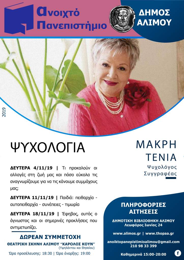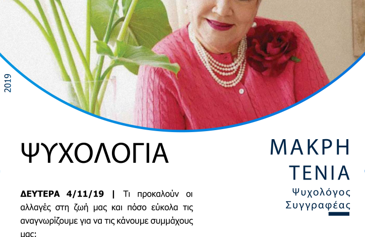 Η Ψυχολόγος και συγγραφέας Τένια Μακρή δεν χρειάζεται ιδιαίτερες συστάσεις .Φτάνει μόνο να σταθεί μπροστά σου να σε κοιτάξει στα μάτια και να μιλήσει στην ψυχή σου. Με υπομονή, κατανόηση και ενσυναίσθηση να σου δώσει μαθήματα ζωής.