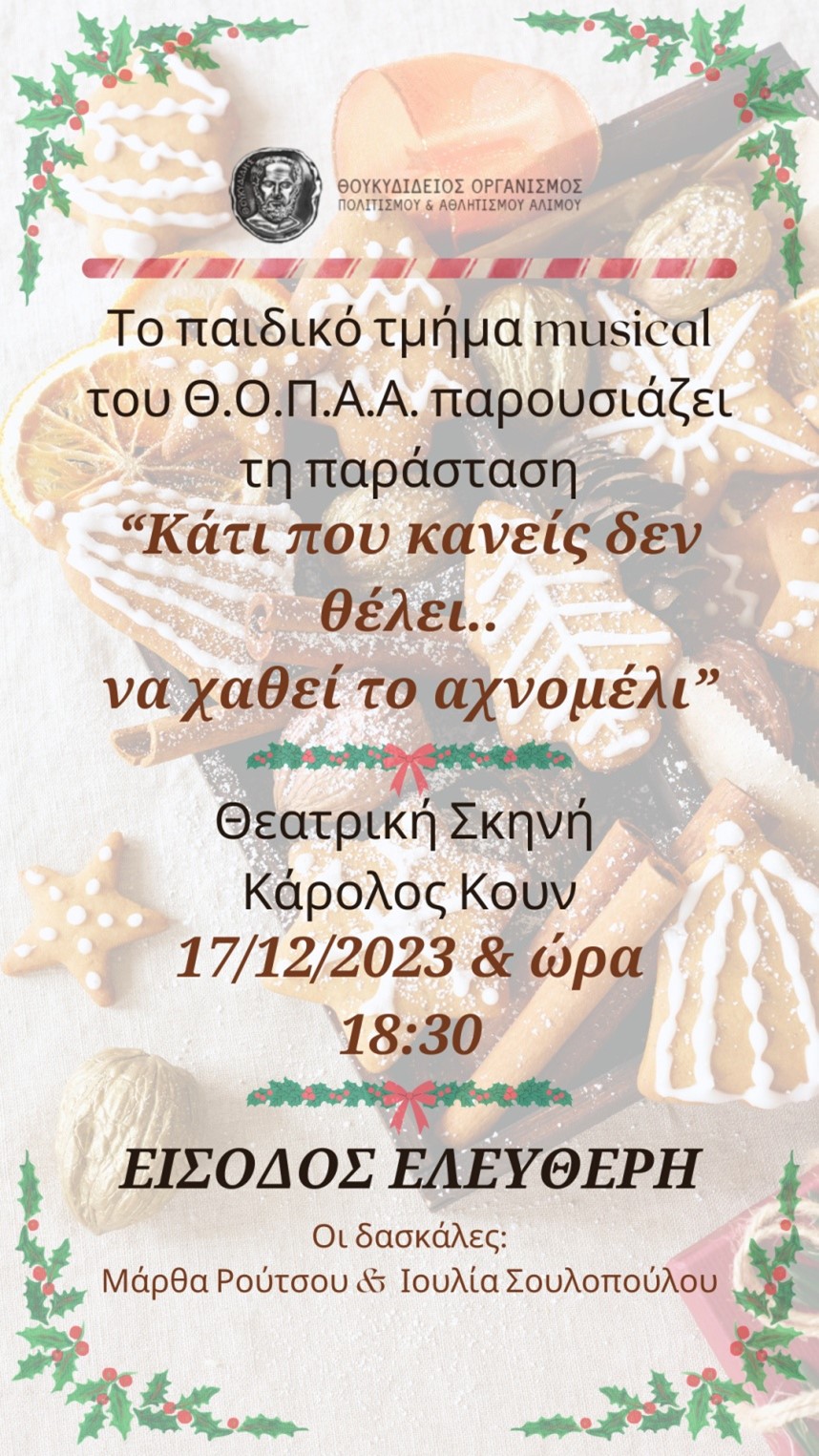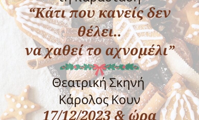 Το δικό τους Χριστουγεννιάτικο θαύμα μας καλούν να μοιραστούμε, τα παιδιά του Παιδικού Τμήματος Μιούζικαλ Θ.Ο.Π.Α.Α μέσα από την παράσταση τους «Κάτι που κανείς δεν θέλει…να χαθεί το αχνομέλι» την Κυριακή 17/12/2023 στην Θεατρική Σκηνή Κάρολος Κουν.