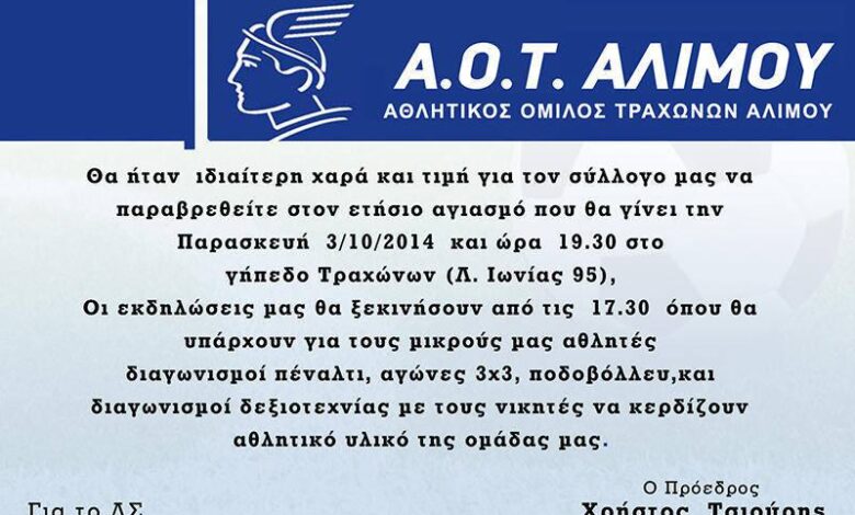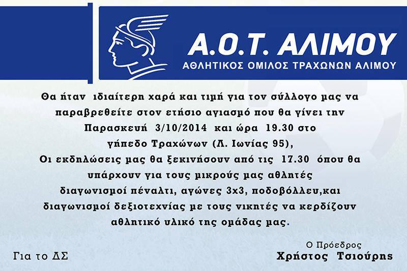 The post Παρασκευή 3/10/2014 στις 19:30, Αγιασμός ΑΟΤ Αλίμου appeared first on trahones-news.gr.