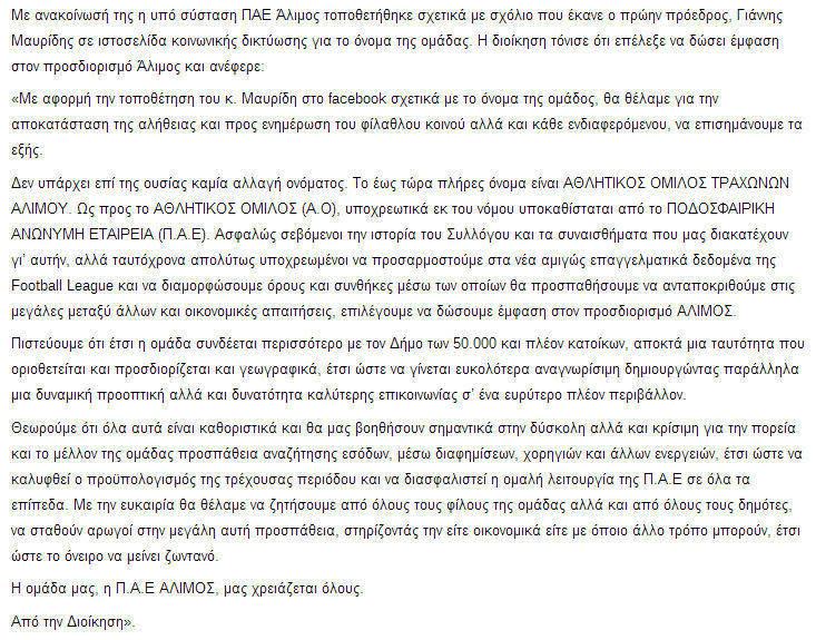 Mέχρι και σελίδα στο facebook με τίτλο “Οχι Στην Αλλαγη Ονοματος Των Τραχωνων” δημιούργησαν οι οπαδοί της ιστορικής ομάδας του Αλίμου. Από χτες μοναδικό θέμα συζήτησης στα καφέ της πόλης μας είναι η αλλαγή ονόματος από Αθλητικός Όμιλος Τραχώνων Αλίμου σε Π.Α.Ε ΑΛΙΜΟΣ. Θα μου πείτε λύθηκαν όλα τα άλλα προβλήματα του Αλίμου και έμεινε μόνο αυτό; ‘Όχι βέβαια, αλλά είναι ένα θέμα που “πονάει” ειδικά αυτούς που τόσα χρόνια ήταν δίπλα στην ομάδα και τη στήριζαν με την παρουσία τους στο γήπεδο, χωρίς να έχουν κάποιο όφελος.