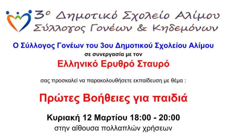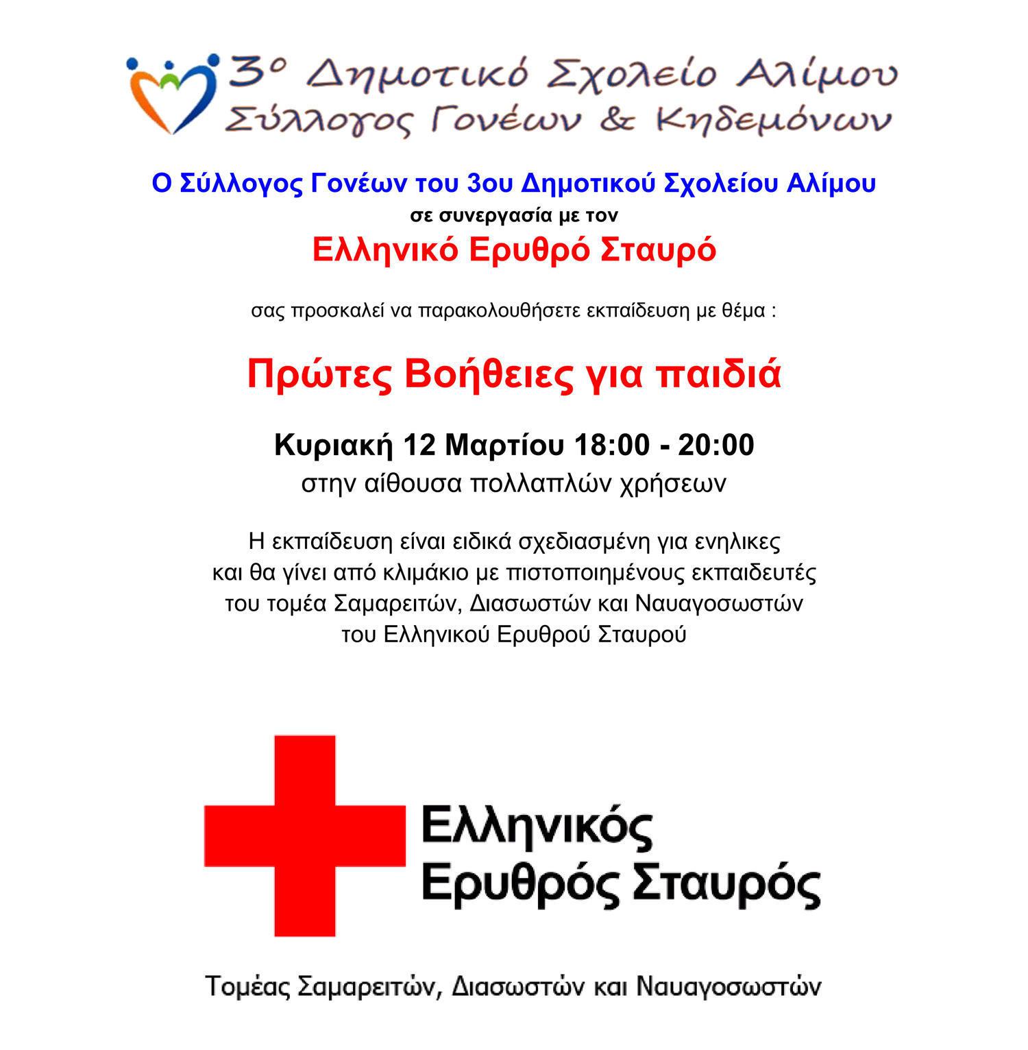 Ο Σύλλογος Γονέων του 3ου Δημοτικού Σχολείου Αλίμου σε συνεργασία με τον Ελληνικό Ερυθρό Σταυρό σας προσκαλεί να παρακολουθήσετε εκπαίδευση με θέμα :