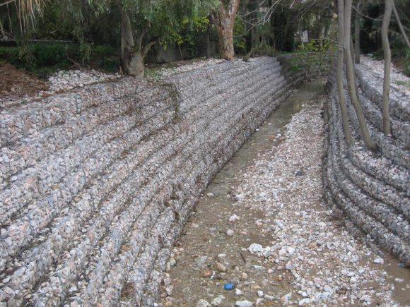 • συνολικός εγκιβωτισμός του ρέματος (αποψίλωση πρανών για να τοποθετηθούν πέτρες τυλιγμένες με συρματόπλεγμα, δηλαδή σαρζανέτια, βλέπε αναρτημένες φωτογραφίες),