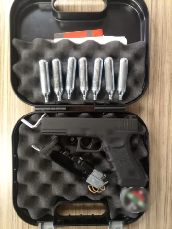 Σε έρευνες που πραγματοποιήθηκαν στα σπίτια των δύο νεαρών που κατηγορούνται βρέθηκαν και κατασχέθηκαν: ένα αεροβόλο πιστόλι με γεμιστήρα, 7 αμπούλες αερίου και ένα μεταλλικό κυτίο που περιείχε μεταλλικές βολίδες.